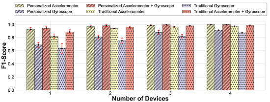 In Figure 7 and Figure 8, we reported the mean and confidence interval of the analyzed metrics, varying the number of devices for both personalized and traditional scenarios. Each column represents the combined results, accounting for all possible device permutations. For instance, focusing on the personalized scenario, the column for a single device reflects the combined results of analyzing the individual data from each sensor (i.e., left wrist, right wrist, left elbow, right elbow). The analysis reveals that, in a personalized scenario, using only one device with accelerometer data, good performance in activity classification is already achieved, measured in terms of accuracy with a score of 93%. As more devices are added, performance improves even when using only one signal type. In particular, when comparing both scenarios (personalized and traditional), we can observe a similar trend where using only two devices with all signal types comes close to the best performance of the algorithm, reaching a total score of 98%, which would otherwise require all devices and signals. Furthermore, the narrow confidence intervals for accelerometers indicate consistent results across different combinations, while the wider confidence intervals for gyroscopes for a small number of devices indicate greater variability in the classification task.