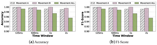 In Figure 9a,b, we investigated the ability to predict motions using the best-performing algorithm, namely the FFNN algorithm. Specifically, we analyzed the prediction accuracy and F1-score for movement A, movement B, and the combination of both motions across different time windows, from 125 milliseconds (ms) to 2 s. In the smallest time window of 125 ms, accuracy is close to 100%, while there is a performance loss for a time window of 2 s. The results indicate a clear correlation between increased time windows and lower accuracy rates for motion classification.