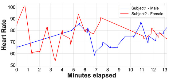 As previously mentioned, during the activity, participants were asked to wear a smart ring to monitor their heart rate and oxygen saturation levels. Figure 10 illustrates the patient’s heart rate fluctuations over a predetermined period of time while performing the AL exercise. It is evident that exercise may cause an increase in heart rate variability, highlighting the physiological differences between a male and female subject during a 24 min exercise session, with the female subject’s heart rate peaking at 120–130 bpm, while the male subject’s heart rate remains just below 90 bpm. The oxygen saturation levels collected during the experiments remained stable, showing no notable patterns or significant variations.