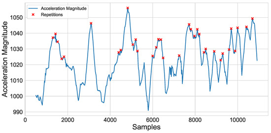 To count repetitions, we developed a simple algorithm to estimate the number of repetitions by identifying peaks in accelerometer signals inspired by the work in [28], assuming that each peak corresponds to a moment of maximum effort during the exercise. This approach treats the problem of exercise repetition detection as a task of finding local maxima in the signal shape. To focus on the signal features that are most relevant for predicting motion, we used accelerometer data from a single device. Now, the accelerometer measures acceleration along three axes (X, Y, Z). To obtain a unified signal that captures the overall motion intensity, we computed the acceleration magnitude, which can be defined as follows, for a device d, at time t and without loss of generality: