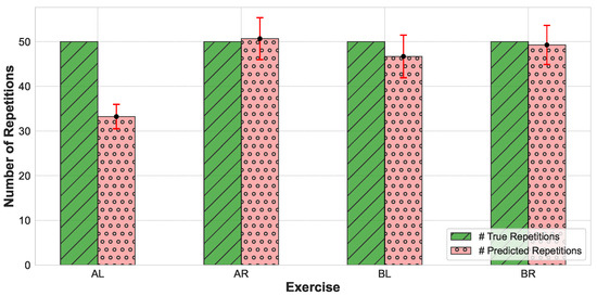 The final analysis aimed to predict the number of repetitions a patient would perform for a given exercise, based on the algorithm described in Section 4.2. Figure 11 illustrates the peak identification performed by the repetition counter algorithm on the data collected during the execution of the AR exercise.