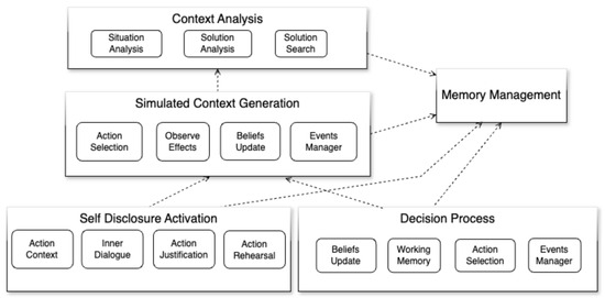 This preliminary phase was necessary to think about a possible agent-based cognitive architecture. Moreover, it led to the possibility of managing the complexity of the healthcare scenario through the agent paradigm and defining, at the implementation level, the nodes and topics needed for the chosen healthcare scenarios; details on the implementation of the healthcare scenario can be found in [47,48].