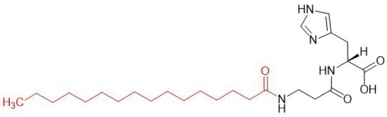 Carnosine (-) is a dipeptide which is also used as a food supplement. Its wound healing activity is a feature making it a cosmetic, especially for eye cream, because stratum corneum around the eyes is the thinnest []. It has been bound with palmitic acid into palmitoyl-carnosine in order to enhance permeation through stratum corneum so that the compound can be effectively used on the whole face (Figure 1).