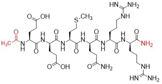 An example of a peptide that inhibits neurotransmitters is acetyl hexapeptide-8 (Argireline, ) (Figure 2), which has an effect similar to botulinum toxin. It inhibits docking of vesicles in neuromuscular synapses, which reduces secretion of acetylcholine to the synapse and as a consequence, the formation of wrinkles []. The structure was based on SNAP-25 protein. It reduces wrinkles, however, the effect is visible after nearly a month [].