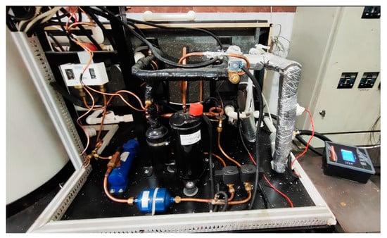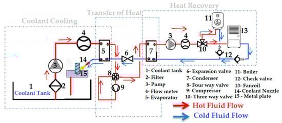 In this study, the developed integrated system controls the temperature and recovers the heat generated in the cutting tool–workpiece contact area. This system not only regulates the temperature of the coolant but also performs the heat energy recovery function. This original cooling and heat recovery system was specially designed and manufactured and then integrated into an existing CNC machining center. The developed system mainly uses a heat pump, and the heat is recovered from the cutting fluid (coolant). From a thermodynamic point of view, heat pumps collect the heat contained in low-temperature energy sources by allowing the refrigerant, which is mostly in the liquid phase in the evaporator (manufactured by MIT, Istanbul, Turkey), to pass into the vapor phase. In terms of the heat source and the sources to which the heat is transferred, heat pumps are called by different names, such as air-to-air, water-to-water, soil-to-air, and water-to-air [13,14]. In this study, the heat source is cooling water, and the source to which the heat is transferred is water. In this case, the heat pump application is of the water (cooling water)-to-water type. In this respect, the study is also unique in terms of heat pumps because no heat pumps application of the coolant to water type was found within the scope of the literature research.