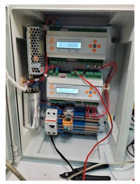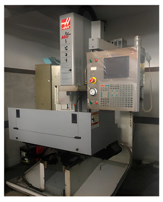 The developed system consists of one compressor with a capacity of 12,350 BTU, two heat exchangers (As Evaporator and condenser manufactured by MIT, Istanbul, Turkey) with a capacity of 5 kW, one fancoil (manufactured by Danfoss, Nordborg, Denmark) with a capacity of 5 kW, a boiler with a capacity of 100 L, one expansion valve, one four-way valve, one three-way valve, and measurement and control equipment. A data logger (specially produced for the Recovery System) was used to collect data obtained from temperature sensors and flow meters placed in critical areas of the system. Additionally, the energy consumption of both the system and the CNC drilling machine was measured for each experiment using serially connected power meters. The data measured through the system are continuously recorded with the help of the data logger at short time intervals, such as 1 min. Photographs of the data logger and machine tool (vertical machining center) used in the experiments are presented in Figure 3 and Figure 4, respectively. The heat recovery system is integrated into the machine tool to carry out the experiments.