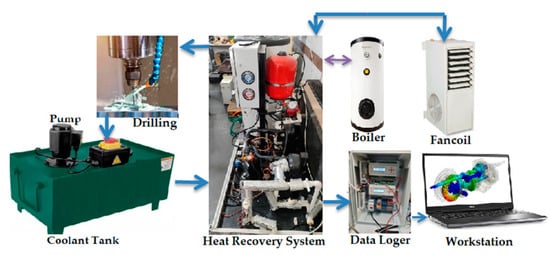 This study was conducted on metal drilling, an important machining method. When the system is widespread among other machining methods, it will turn into a great potential benefit that has been neglected so far. Therefore, considering the improvement in machining quality and the reduction in cutting-tool and cutting-fluid usage, it will contribute significantly to productivity and sustainability. In this paper, the design and integration of the developed coolant heat recovery system will be explained first, followed by the presentation of the experimental setup and parameters, the evaluation of the system’s performance under different cutting parameters, and finally a discussion on energy recovery and system efficiency.