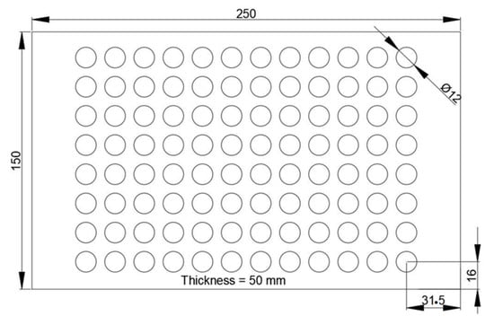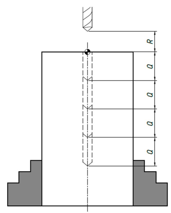 The heat recovery system is integrated into the machine tool (vertical machining center, manufactured by Haas Automation, Inc., Oxnard, CA, USA) to carry out the experiments. The test specimen dimensions used in the experiment are shown in Figure 6. For the experiments, 27 prismatic test samples are prepared from AISI 1045 (Ereğli Iron and Steel Works Co., Zonguldak, Turkey) manufacturing steel with dimensions of 250 × 150 × 50 mm. The samples are drilled with a 12 mm diameter HSS drill bit(manufactured by Machine Tool Industry (MTE), Kırıkkale, Turkey) using the different parameters in Table 1 as 96 holes per part. In total, 2592 holes were drilled throughout the experiments. For consistency, the drill bit was replaced with a new one after completing each sample part. This means that each drill bit was used to drill 96 holes, making tool wear more pronounced and facilitating accurate measurements. Only one drill bit was employed for each part. The drill used had a tip angle of 118° and was made of HSS material. The G83 peck drilling cycle was applied during the process, with the drill bit retracting completely above the part every 5 mm (e.g., G83 X31.5 Y-15. Z-55. Q5. F21.2). This ensured that the coolant directed from the nozzle could effectively reach the interior of the hole multiple times. The G83 peck drilling cycle also extends tool life by facilitating chip evacuation and improves machining quality by improving cooling. G83 peck drilling cycle is shown in Figure 7.