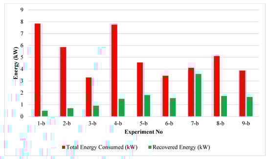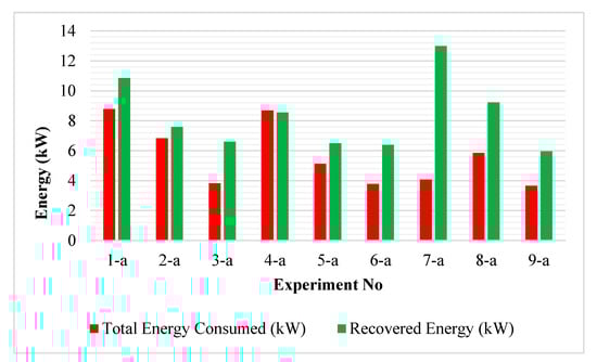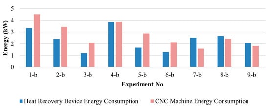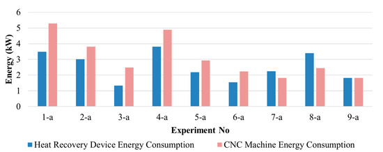 Energy is the most important cost item in the production sector. For this reason, many academic studies are conducted on energy consumption and energy models in production [15,16]. Studies have mostly focused on how energy consumption can be reduced [17,18]. In this study, the energy consumptions of the heat recovery system and the CNC machine tool are measured separately for each experiment to compare with the energy recovery. The measurement results of energy consumptions at 15 degrees and 20 degrees are shown graphically in Figure 8 and Figure 9, respectively.
