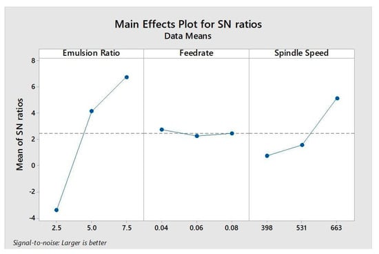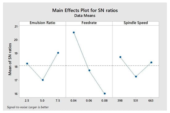 Figure 14 illustrates the S/N analysis results for heat recovery. The graph identifies the optimal levels of parameters based on the highest signal-to-noise ratio. For a temperature setting of 20 °C, the optimal values are as follows: an emulsion ratio of 7.5%, a feed rate of 0.04 mm/rev, and a spindle speed of 663 rpm. Moreover, analyzing the range between the maximum and minimum S/N ratios for each parameter highlights the most influential factor, with the emulsion ratio emerging as the dominant parameter. This observation aligns well with the findings obtained from the variance analysis.