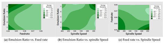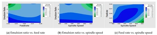 Contour graphs for 15 °C are given in Figure 12. As can be clearly seen from the graphs in this Figure 12, the energy gained increased as the feed rate value decreased.