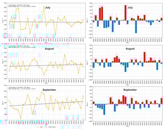 In July 2023, the total surface incoming direct radiation (SID) in the Lublin area reached 360.15 MJ·m−2, exceeding the multi-year average by 29.10 MJ·m−2 and placing it at the 73rd percentile, near the upper quartile of recorded SID values. The linear trend for July indicated a decrease of 2.2 MJ·m−2 per year in SID totals, though this trend was not statistically significant (p = 0.792) (Figure 1). In August 2023, the SID total in the Lublin area was 287.67 MJ·m−2, representing an anomaly of −15.36 MJ·m−2 and placing it at the 42nd percentile, below the multi-year average. This positioned August 2023 closer to the lower quartile for SID totals. The trend for August showed a minor increase in SID totals, approximately 6.9 MJ·m−2 per decade, though this trend lacked statistical significance (p = 0.429). In September 2023, the recorded SID total in the Lublin area was 258.30 MJ·m−2, with a positive anomaly of +66.65 MJ·m−2 above the long-term average of 191.65 MJ·m−2. This value ranked at the 87th percentile, placing September 2023 near the upper quartile for SID totals. The linear trend for September indicated a gradual increase of 11.97 MJ·m−2 per decade in SID totals, yet this trend did not reach statistical significance (p = 0.271) (Figure 1).