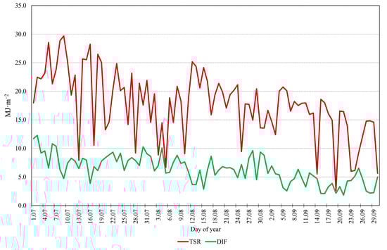 Course of daily total (TSR) and diffuse (DIF) radiation sums from July to September 2023 in Lublin.