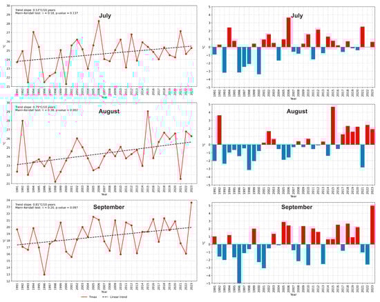Multi-year variability and anomalies of Tmax in Lublin in July, August, and September during the period 1991–2023.