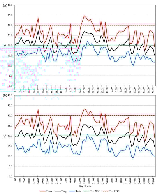 Course of daily Tavg, Tmax, and Tmin at Litewski Square (a) and in the Botanical Garden (b) from July to September 2023.