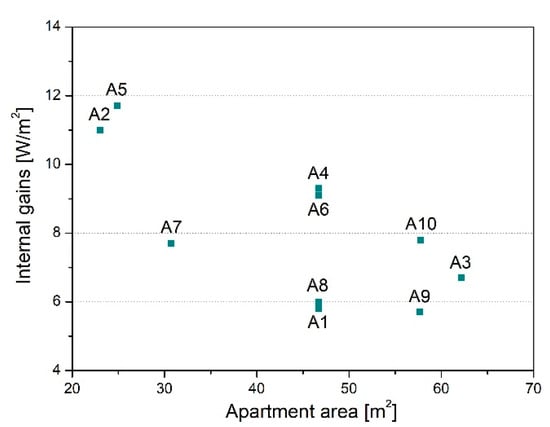 Residents were also asked to fill in a questionnaire concerning their daily routines of presence or absence in the dwellings, the use of electric devices, and window opening and shading (Table 4). Based on the interviews, internal gains per m2 were calculated with the use of [8]. They included heat emitted by residents, lighting, and everyday use of domestic equipment. In apartments A4 and A5, 50-litre water boilers were installed, raising inner gains. Generally, in the larger apartments, the average internal gains per square metre were smaller (Figure 7), and the values ranged from 5.7 to 11.7 W/m2.