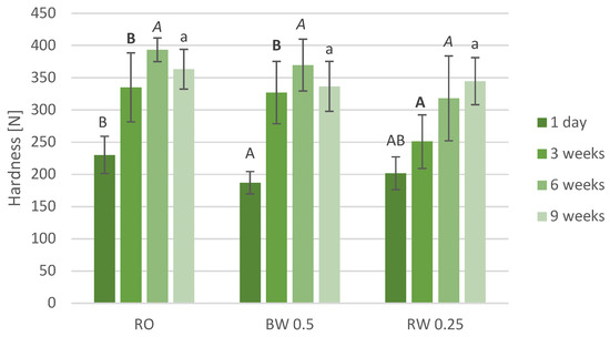 Changes in the textural properties of the chips during storage depending on the frying medium used. A, B; A, B; A, B; a, b—indicates homogeneous groups determined by Tukey’s test (p-value < 0.05) for different storage times.
