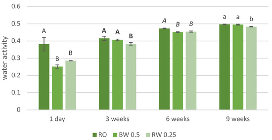 Changes in water activity of the puffed chips during storage. A, B; A, B; A, B; a, b—indicates homogeneous groups determined by Tukey’s test (p-value < 0.05) for different storage times.