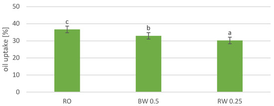 Oil uptake of puffed chips. a, b, c—indicates homogeneous groups determined by Tukey’s test (p-value < 0.05).