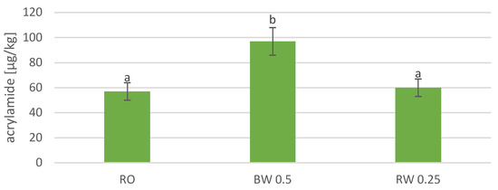 The acrylamide (AA) content of puffed chips. a, b—indicates homogeneous groups determined by Tukey’s test (p-value < 0.05).