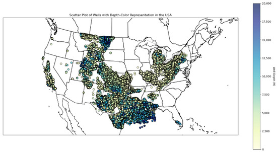 Distribution of the abandoned and orphan wells across the United States with each well represented by a dot. The color of each dot represents the depth of the well, as indicated by the color bar on the right side of the plot, with depths ranging from approximately 2500 ft to 20,000 ft. Darker colors (toward blue) represent deeper wells, while lighter colors (toward yellow-green) indicate shallower wells [18].