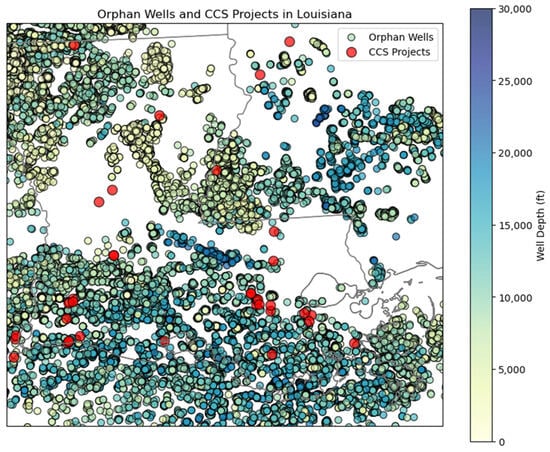 Figure 3 shows the distribution of abandoned and orphan wells across the United States with depth. These wells pose significant environmental risks, not only due to methane emissions and potential contamination of subsurface freshwater but also by compromising efforts to store CO2 in the subsurface. These wells also present critical challenges to CO2 storage efforts, as they often lack proper cement barriers, potentially serving as leakage pathways if CO2 storage sites intersect with them. As such, this map is an invaluable tool for identifying optimal storage depths and locations, enabling the avoidance of areas with high concentrations of orphan wells to mitigate the risk of leakage. In scenarios where storage must occur in regions densely populated with orphan wells, the map underscores the necessity of drilling deeper injection wells to bypass these compromised structures, thereby enhancing the security and effectiveness of CO2 storage operations. These findings underscore the importance of addressing orphaned and abandoned wells to reduce methane emissions and ensure the integrity of future carbon capture and storage (CCS) projects. Figure 4 shows the location of the potential CCS project and the surrounding orphan and abandoned wells in the state of Louisiana. Most of the depth of the CCS is located in the range of the orphan and abandoned well depths. This lead also emphasizes the need for strategic well management and plugging practices, particularly in regions with high concentrations of these wells, to mitigate their environmental impact.