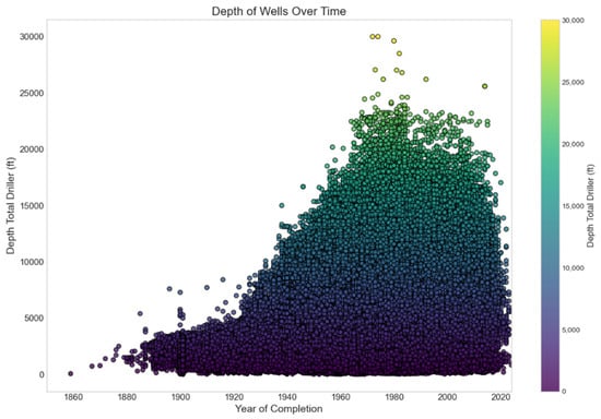 The scatter plot in Figure 5 displays the depth of wells drilled over time, from the mid-1800s to the present. Each point represents a well, with its position on the vertical axis showing the depth in meters, and the color gradient indicating the depth in feet. The plot reveals a clear trend of increasing well depths over time, particularly from the 1950s onwards, reflecting advancements in drilling technology and the pursuit of deeper hydrocarbon resources. The concentration of deeper wells in more recent decades, as seen in the upper part of the plot, highlights the industry’s evolution towards more challenging drilling operations. This trend underscores the increasing complexity and technical demands of well drilling over time.