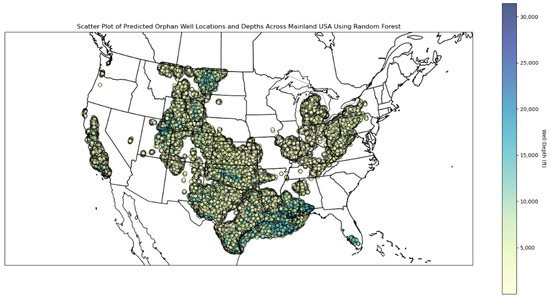 To locate orphan wells, several methods are employed, each tailored to different scenarios as shown in Table 3. These include a review of historical records (such as ownership, production, and land use data), conversations with residents, and observational studies (such as soil and bedrock analysis, mapping of anthropogenic features, and nearby water well histories). Ground-based geophysical methods, including ground-penetrating radar, electrical resistivity tomography, seismic refraction tomography, and magnetometry, are utilized alongside aerial surveys, such as drone-based magnetometry, LiDAR scanning for surface anomalies, and methane detection. Visual methods, like aerial photographic interpretation and excavation, are also used for direct verification of well locations. Additional techniques, such as electromagnetic surveys, pressure transient analysis, stress disturbance assessments, and unmanned aerial vehicles (UAVs) equipped with advanced sensors, further enhance the ability to accurately locate wells. Satellite surveys add a layer, enabling wide-area coverage and high-resolution monitoring of surface conditions associated with orphan wells. These methods vary in cost, accuracy, and applicability, requiring careful selection based on specific conditions [29,30]. Therefore, this paper introduces a machine-learning method to predict the location of the orphan wells based on the available data and using a Random Forst regressor. The resulting predictions were visualized on a scatter plot overlaid on a U.S. map, with well depths represented by a color gradient as shown in Figure 6. This method provides a scalable and efficient tool for identifying regions at risk of methane emissions and environmental hazards due to undocumented orphan wells, enabling more targeted monitoring and remediation efforts.