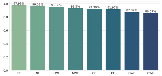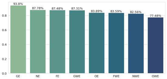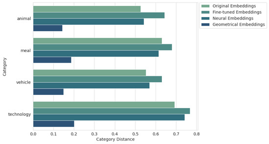 In order to look deeper into the data, it was decided to also present the mean category distance relative to each category separately. As can be seen in Figure 8, the category that allowed the keyword embeddings to come closest to the category embeddings was the animal category. By far, the worst category in this respect was technology, although the geometric embeddings also did well here (0.201). The only category that managed to improve its performance (excluding geometric embeddings) was the food category, where the neural embeddings (0.614) performed slightly better than the original embeddings (0.631).