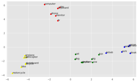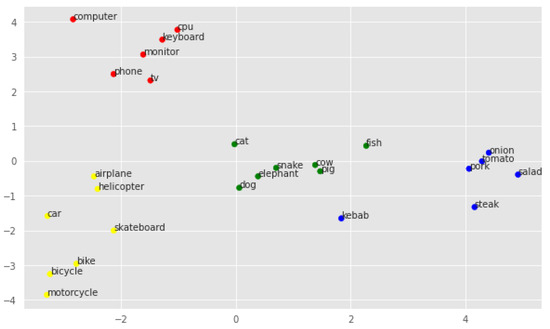 - Adapting other features: Beringer et al. created embeddings by combining the embedding of a word and the embedding of the meaning of that word, for example, the word tree and its meaning forest, or tree (structure). They called them keyword embeddings. In the case of the experiment conducted in this thesis, the embeddings of the word and the category were combined, like cat and animal, or airplane (technology). An embedding created in this way is called a keyword–category embedding. The term keyword embedding is used to describe any word contained in categories, such as cat, dog, etc. The term category embedding describes the embedding of a specific category word, namely animal, meal, technology, or vehicle.
