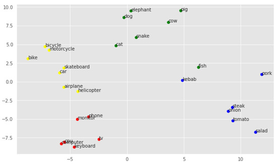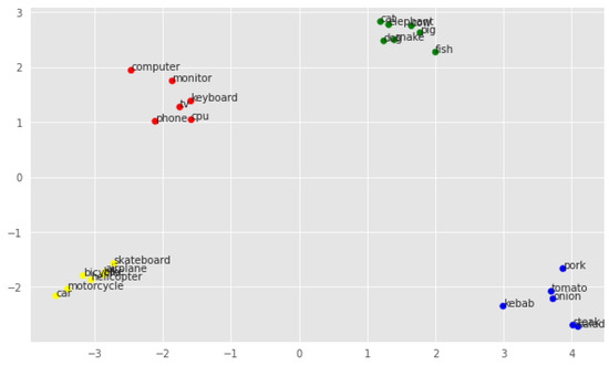 The words defining each category were selected such that the boundaries between categories were fuzzy. For instance, the categories vehicle and technology, or meal and animal, overlap to some extent. Additionally, some keywords were chosen that could belong to more than one category but were deliberately grouped into one. An example is the word fish, which can refer to both a food and an animal. This was carried out intentionally to make it more difficult to classify the text and highlight the contribution our word embeddings aim to address.
