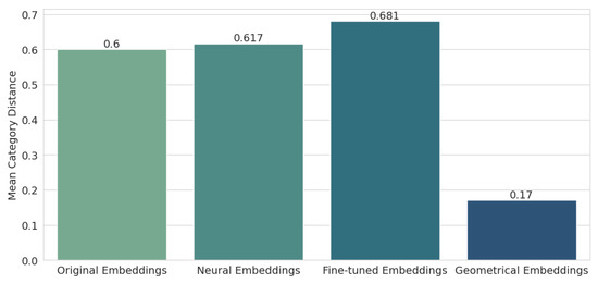 Next, the mean distance from the semantic embeddings to the category embeddings was checked. The results are shown in Figure 7. It turns out that the geometric embeddings are by far the best here (0.17), improving the result of the original embeddings (0.6) by more than three times. The characteristics of the embedding displacement in the space method indicated that it would perform best for this particular test, but the results for the neural embeddings (0.617) and the fine-tuned embeddings (0.681) are surprising, as they were worse compared to the original embeddings.