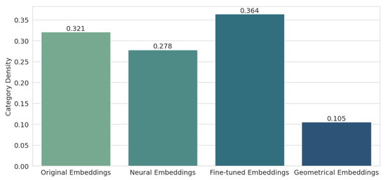 Next, we examined the category density metric, the results of which are shown in Figure 9. Here, the situation looks a bit better, as the results for two methods—neural (0.278) and, of course, geometric (0.105), improved over the original embeddings (0.321). This confirms what was observed when visualizing the PCA for the different types of embeddings, namely that geometric embeddings have excellent separability, and the keywords within classes are very close to each other, while fine-tuned embeddings blur the spatial differences between clusters, and individual words move away from their respective clusters.