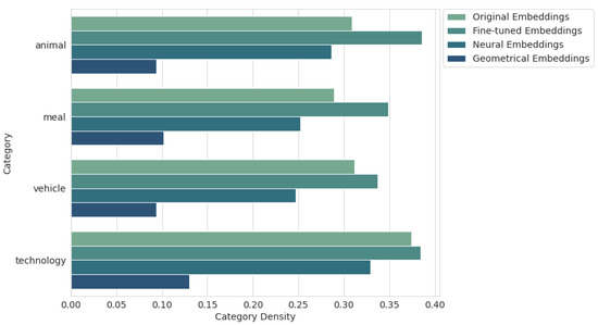 Figure 10 shows the category density results for each category separately. Our suspicion about the problematic meal and animal classes for fine-tuned embeddings, observed in the PCA visualization in Figure 5, was confirmed. In fact, the values for these categories are very high (0.349 and 0.386, respectively), and the technology category also has a low density (0.384). Meanwhile, the least problematic category for most methods is the vehicle class.