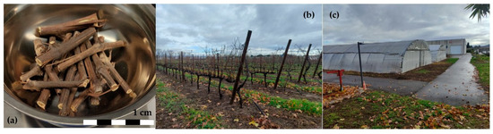 (a) Vine shoots from pruning residues used in the research. (b,c) The agricultural experimentation field of the University of La Rioja.