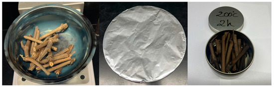 Three different forms of testing were proposed. The first consisted of placing the vine shoots directly on the pyrolytic oven tray on a metal tray without a lid (WL) (Figure 2). In other words, during the test time, the raw material of the vine shoots was directly in contact with the atmosphere inside the furnace. The second way of testing was that these vine shoots were covered with a metal lid (L). This lid consisted of a sheet of aluminium foil, which was cut and placed on top of the tray, with the edges shaped by hand in an attempt to make it as airtight as possible (Figure 2), partially preventing the raw material from being in direct contact with the atmosphere inside the furnace. This test methodology has also been used in previous research [13,33]. Finally, the carbonisation of the vine shoots was tested in a completely airtight manner using a screw-top can (C) into which the vine shoots were inserted (Figure 2).