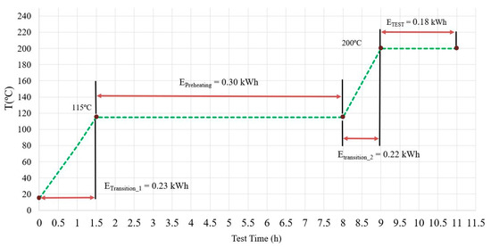 For this purpose, it was decided to account for the energy consumed in the tests by means of an electricity metre connected to the furnace. As mentioned above, all the test samples were subjected to forced drying or preheating in order to remove moisture. Therefore, we started from an ambient temperature inside the oven of approximately 15 °C and raised the temperature to the preheating temperature (115 °C). Stabilisation at a temperature of 115 °C was achieved within one and a half hours. This resulted in a heating rate of 1.3 °C/min. This is evident in the first ramp graphed at Figure 3. In this first transition stage, energy was consumed, which we have called ETransition_1. Subsequently, once the preheating temperature had been reached, it remained in this situation for a period of 6.5 h. The energy consumed in this phase is referred to as EPreheating. Once the moisture has been removed from the sample, the temperature is increased to the test temperature (200 °C, 250 °C, 300 °C, 350 °C, 400 °C or 450 °C). Therefore, another transition stage of temperature increase was necessary. The duration of the second transition stage was one hour, with different heating rates depending on the final test temperature, as shown in Table 1. The energy consumption of this stage was collected in the variable ETransition_2. Once the test temperature had been reached, the only variable that could be altered was the duration of the test, 2 h or 3 h, and this energy was recorded as ETest, i.e., the energy consumed in the pyrolysis test. This last recorded energy value will be used to calibrate the process optimisation. In this research, the evaluation and influence of the different speeds of heating in the tests have not been considered and will be left for future research. It is assumed that different heating speeds were obtained and that the result was a function of the final test temperature and the average time taken to raise the temperature to the desired final temperature.