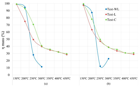 It should be noted that the WL test results had poor C yields. For the same test conditions, e.g., at 300 °C for 2 h, there was an average decrease of 22.98% of the carbon content. Likewise, it is again evident that these WL tests could not be carried out for temperatures above 300 °C, concluding that for the case of the carbonisation of the vine shoots in these WL conditions, the maximum percentage of carbon was 17.16%, obtained in the 250 °C for 2 h test.
