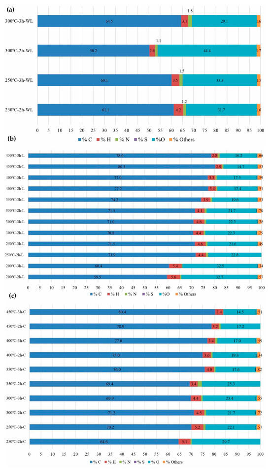 The resulting elemental compositions according to the different test types (WL, L and C) are shown in Figure 6. It is important to note that a high ratio of high carbon to low oxygen content improved the calorific value considerably, while an excessive amount of oxygen could reduce the combustion efficiency and lead to incomplete combustion [36]. The results seem to corroborate the clear trend mentioned above: the higher the temperature reached in the test, the higher the percentage of carbon obtained, at least in that temperature range (<450 °C). The chemical composition values for the WL tests are shown in Figure 6. As expected, this type of test was the least efficient of those studied, as the temperatures could not be raised above 350 °C, because the complete combustion of the vine shoots occurred. In addition, there was a high content of other undesirable elements, such as oxygen or hydrogen.