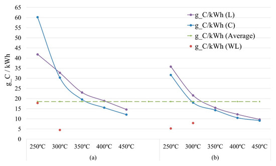 First, the optimisation was studied for the average amount of carbon obtained in the tests, which turned out to be 10.12 g per test. The average amount of energy consumed in the tests was also calculated, which is 0.55 kWh/test, resulting in an average of 18.54 g C per kWh. With these average values, an analysis of differences between the C and L tests could be carried out. This average value (horizontal line of 18.54 g C/kWh) is shown in Figure 7, and the results are separated according to the duration of the tests (2 h and 3 h). Analysing the type C tests, it can be seen that the function of the type C tests intercepted the average value almost at the 350 °C for 2 h test. On the other hand, for the case of the type L test function, this intersection occurred for the 400 °C for 2 h test. The same pattern was again shared for the three-hour duration results, where the average value of 18.54 g C/kWh was achieved at the 300 °C for 3 h point for the C type tests, while in the case of the L type tests the intersection point is between 300 °C at for 3 h and 350 °C at for 3 h. The first conclusion to be drawn from this analysis is that the same values of average carbon content per kWh used were reached earlier in the type C tests than in the type L tests, i.e., for lower temperature values. This means that the carbonisation process was most effective when carried out in the airtight conditions provided by the can.