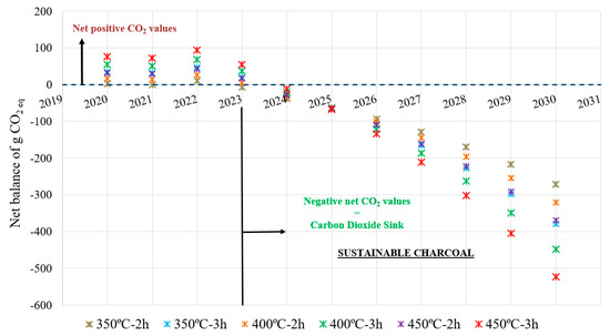 The most remarkable results were generated in terms of sustainability, as the evaluation of net CO2 eq emissions has shown that it is possible to generate charcoal with a zero-carbon footprint from 2023 onwards, and that it behaves as a carbon sink. Since, for example, for the time horizon of 2030 and test conditions of 450 °C for 3 h, the production of charcoal from only 40 g of vine shoot waste will lead to the sequestration of −522.74 g of CO2 eq, a very promising future scenario of production at the industrial level is given.