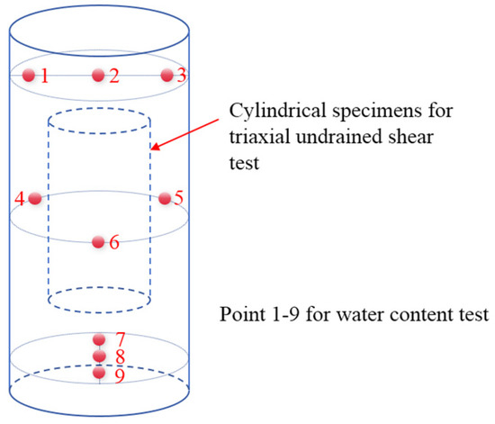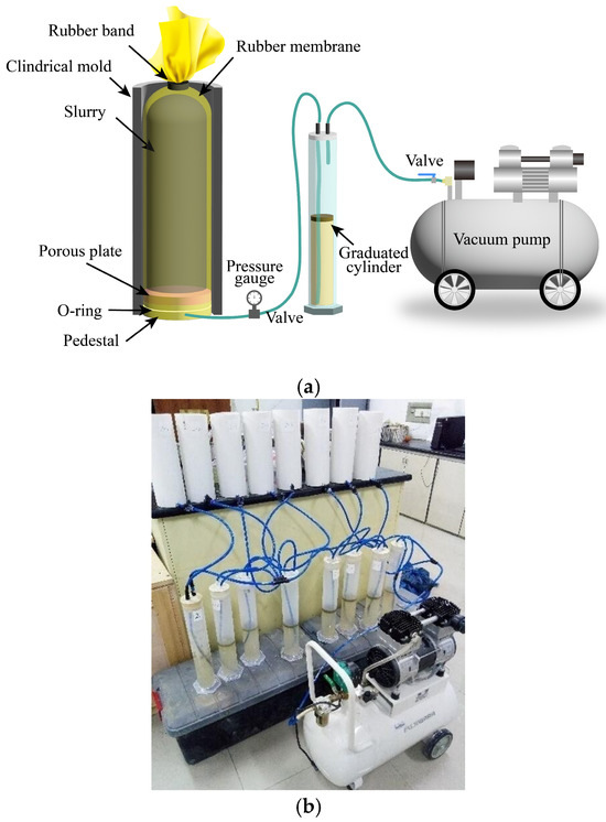 As shown in Figure 1, a vacuum consolidation device was used. Each sample was placed in an individual mould and several batches of samples were prepared simultaneously by joining all the pedestals as a circuit. Because of the small sample size, both the uniformity of the samples and the efficiency of their preparation were ensured. Using a vacuum pump to create a negative pressure inside the consolidation cylinder, we increased the negative pressure by 15 kPa every 12 h until a vacuum level of 90 kPa was reached. After sediment consolidation, samples with a diameter of approximately 80 mm and a height of approximately 150 mm were obtained.