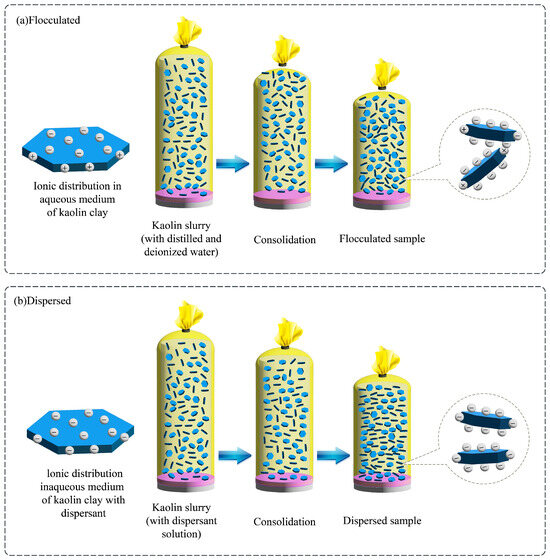 Kaolin is a 1:1 sheet silicate composed of two types of layers, negatively charged tetrahedral layer [(Al2[OH]4)+2] and positively charged octahedral layer [(Si2O5)−2]. The consolidation processes of the flocculated and dispersed samples are shown in Figure 2. The faces of the particles became negatively charged while the edges of the particles had positive charges. This arrangement makes the edges of the particles cling to the faces of the other particle, while the faces of the two particles repel each other. This arrangement resulted in the formation of flocculated kaolin clay after aggregation and sedimentation. The presence of a dispersing agent (Calgon) chiefly affected the ionic environment. All the particles have charged surfaces and repel each other as much as possible. Therefore, particles tend to stack in a face-to-face contact manner and form the dispersed kaolin clay after aggregation and sedimentation [27].