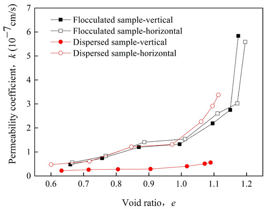 Permeability coefficient–void-ratio curves of kaolin clay for flocculated and dispersed samples in vertical and horizontal directions.