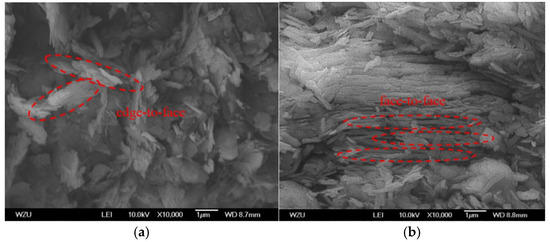 SEM and MIP tests were conducted on flocculated and dispersed samples to study the structures of the two types of samples. Cut some soil samples with dimensions of 1 cm × 1 cm × 2 cm from the specimen, immediately place them into a liquid nitrogen tank until complete freezing had occurred, then introduce all the samples into the freeze-drying device. After the sublimation is complete, some samples are used for SEM tests with a magnification of 10,000 times while others are broken in half to form 1 mm3 samples for MIP tests. Figure 5 shows the SEM images of the samples at a magnification of 10,000 along the vertical direction. This confirms that the prepared samples have different structures; the clay platelets in the flocculated structure exhibit a random orientation with edge-to-face contacts (Figure 5a) and exhibit a layered arrangement with face-to-face contacts in the dispersed structure (Figure 5b). In Figure 6a, it is clear that the accumulated mercury volume for the flocculated sample is higher than that of the dispersed sample. Figure 6b shows that the flocculated sample contains much larger pores (>5 μm) than those of the dispersed sample, which indicates that compared to the dispersed samples, the flocculated samples have a larger initial pore volume and larger-sized pores.