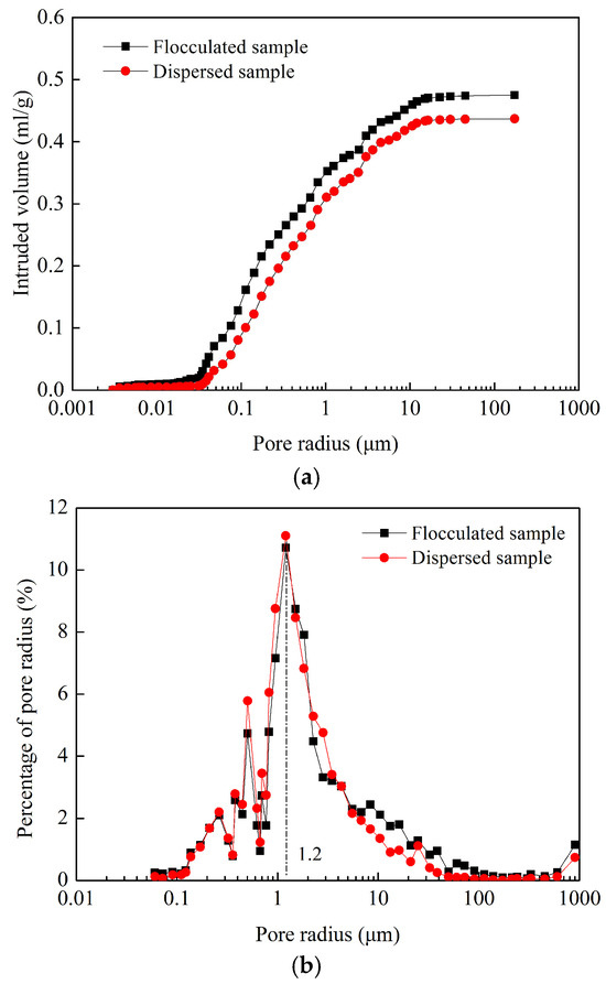 Pore size distribution of flocculated and dispersed samples: (a) intruded volume and (b) percentage of pore radius.