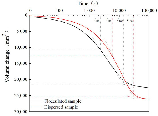 Drainage volume–time relationship of flocculated and dispersed samples.