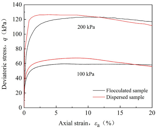 Deviatoric stress–axial-strain relationships of flocculated and dispersed samples subjected to effective confining pressures of 100 kPa and 200 kPa.