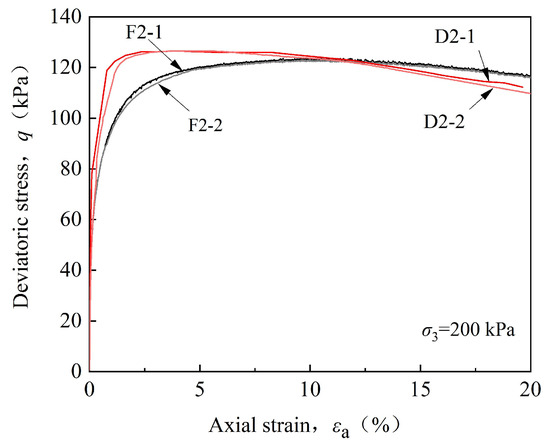 To verify the repeatability of the tests, two sets of F2 and D2 tests were conducted on the samples. The water contents of the two flocculated samples in tests F2-1 and F2-2 were 45.48% and 45.93%, respectively, and those of the two dispersed samples in tests D2-1 and D2-2 were 39.74% and 40.62%, respectively. The relationship curves of deviatoric stress versus axial strain at an effective confining pressure of 200 kPa for the two sets of flocculated and dispersed structural samples are shown in Figure 10. The relationship curves of deviatoric stress versus axial strain for the two sets of flocculated and dispersed structural samples are in good agreement, indicating good test repeatability.
