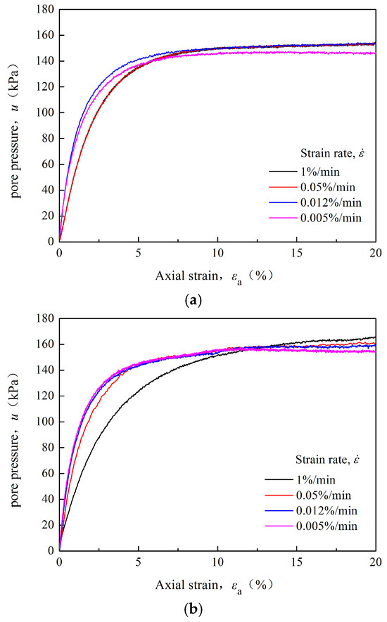 As shown in Figure 11a, when the strain rate increases, the response speed of the pore pressure decreases. The pore pressure response curves at strain rates of 0.012 and 0.005%/min were similar, indicating that the pore pressure of the flocculated samples could fully respond at a strain rate of 0.012%/min. Figure 11b shows the development of pore pressure with axial strain under different strain rates for the dispersed samples at an effective confining pressure of 200 kPa. The overall pattern is similar to that of the flocculated samples. The pore pressures of the dispersed samples also fully responded at a strain rate of 0.012%/min. Compared with the flocculated samples, the pore pressure response of the dispersed samples was much slower at a strain rate of 1%/min. In the triaxial undrained shear tests, the pore water pressure is typically measured from the base, as shown in Figure 4. The permeability coefficient of the dispersed sample in vertical direction is much smaller than that of the flocculated sample. A shear rate of 1%/min is too high for the dispersed sample, when the stain rate is too fast, the pore pressure at the top of the sample cannot diffuse to the bottom quickly. In this case, the pore water pressure measured at the bottom cannot represent the actual pore pressure of the sample.